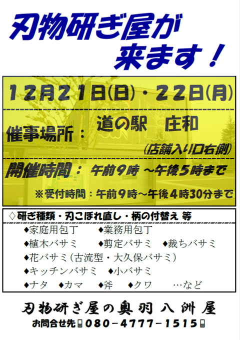 ・12/22(火)~12/24(木)出張刃物研ぎを開催しました。